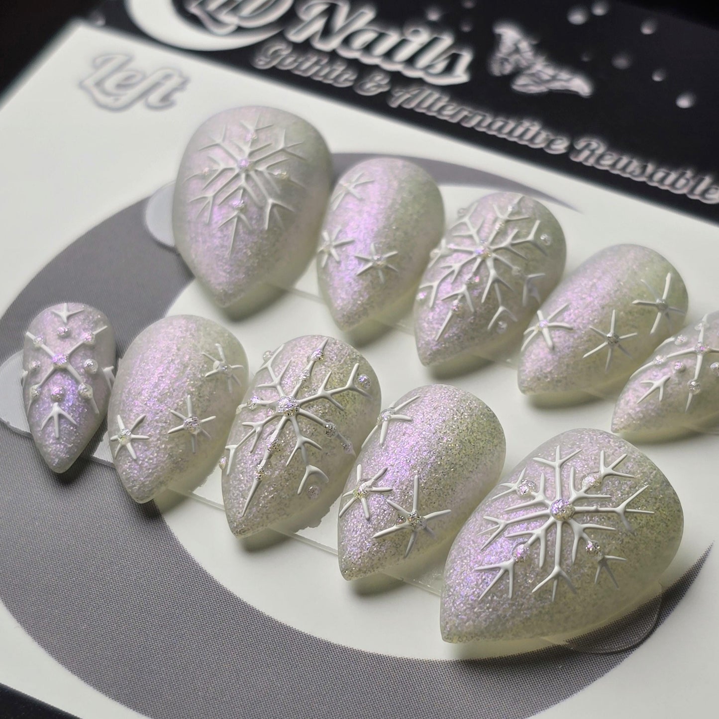βοΈβ¨οΈ Frostfall is a witchy winter press-on nail set featuring a matte iridescent silver glitter base with hand-painted white snowflake detailing. Each nail has a soft frosted sparkle that gives the design a clean, winter-magic look.