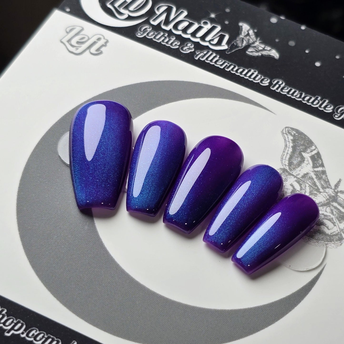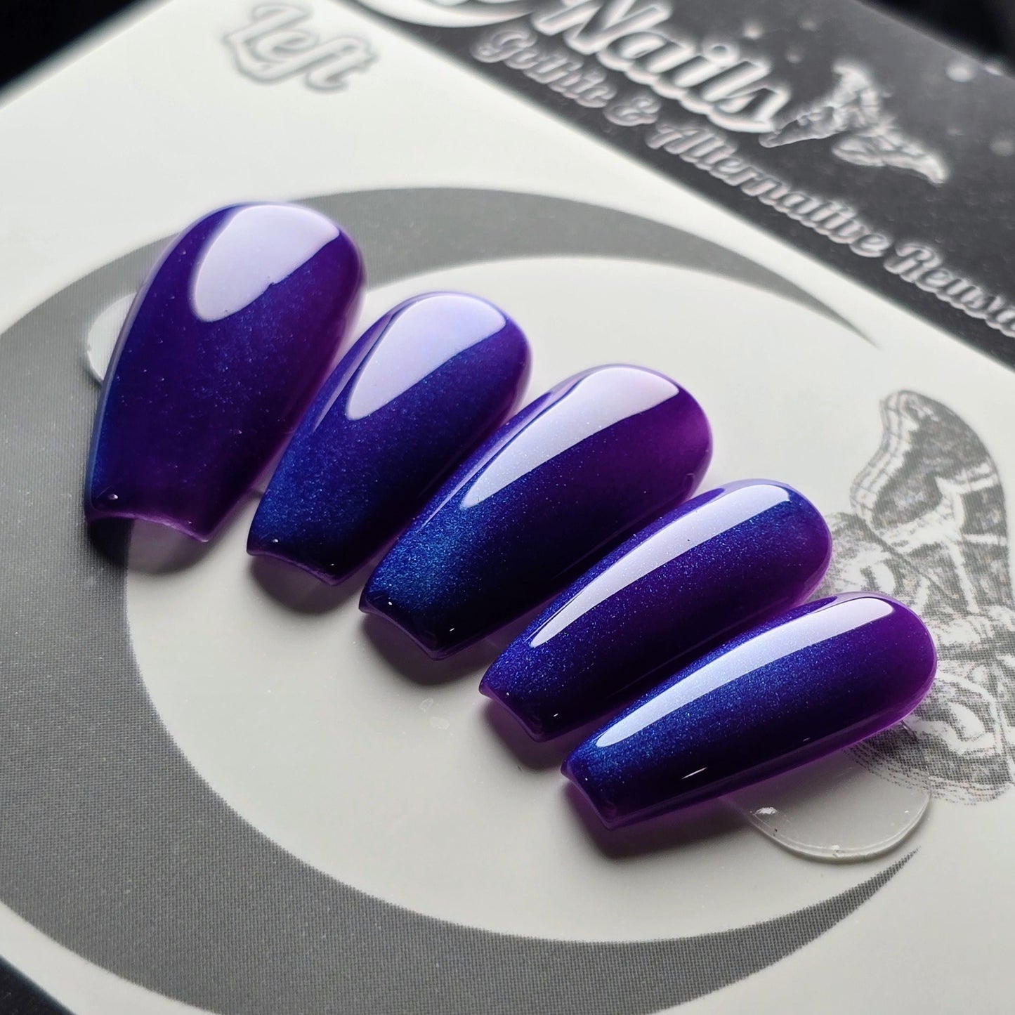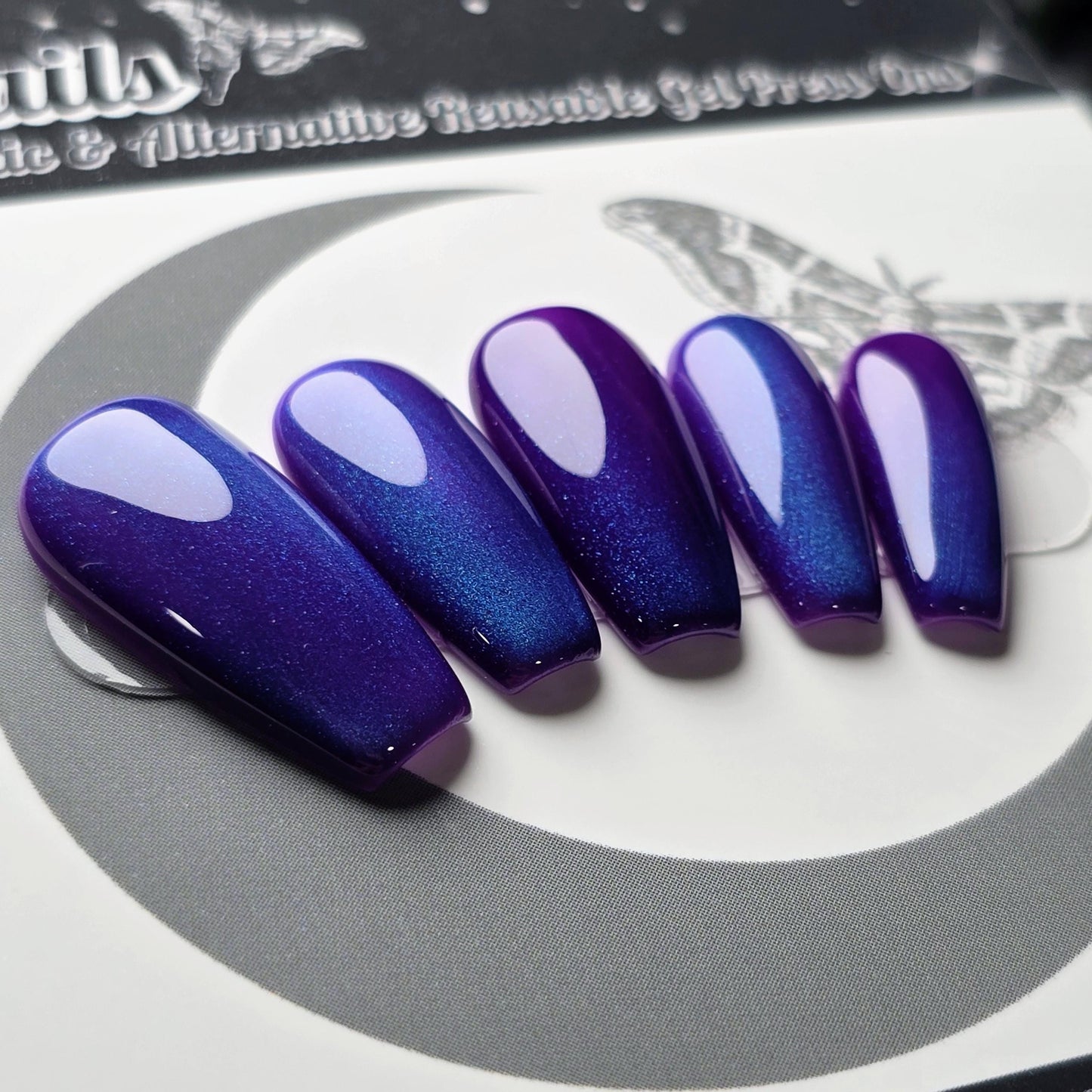 This design features a deep violet base infused with electric blue magnetic shimmer, creating a soft galaxy effect that shifts beautifully in the light. Elegant, dark, and just a little otherworldly, Blueberry is perfect for gothic nail lovers, night owls, and anyone craving a dramatic but wearable statement set.