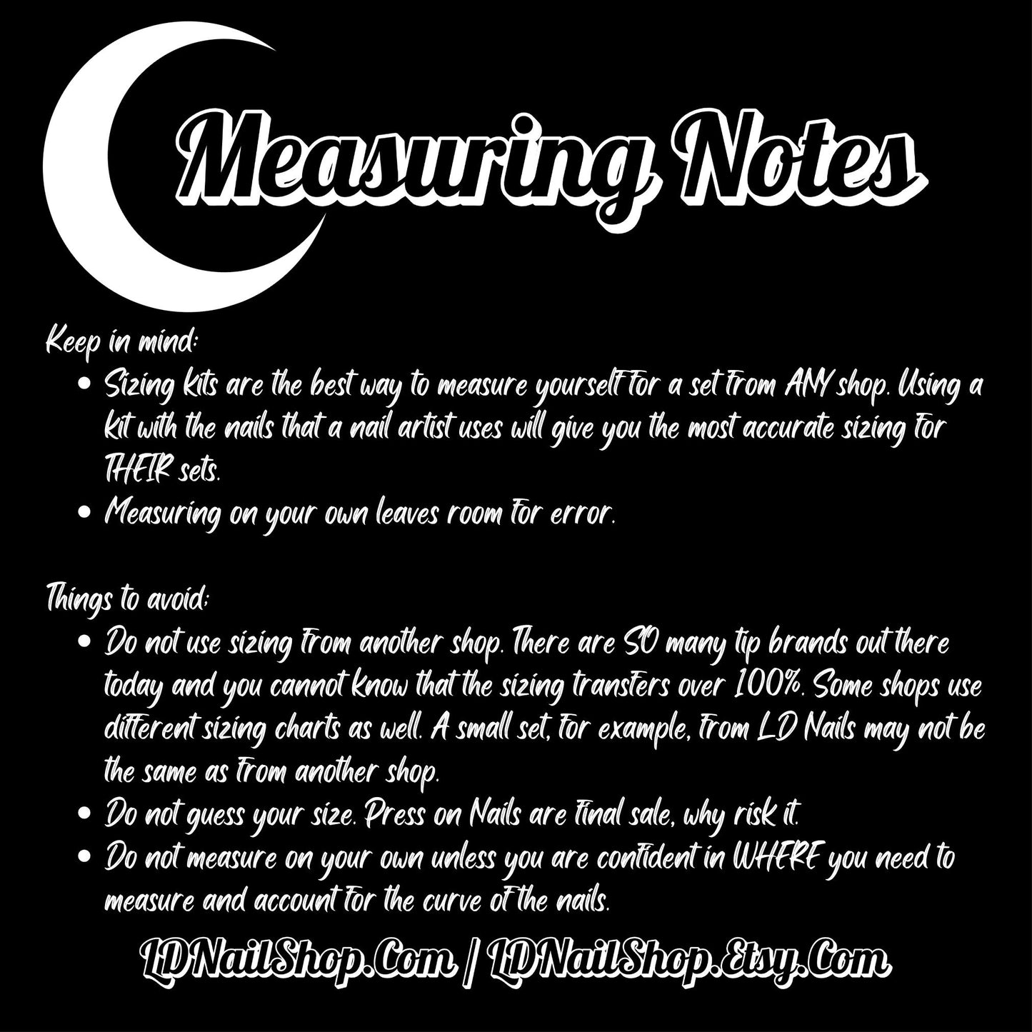 If you choose to measure your own nails, please ensure you are measuring properly. Detailed instructions on how to do so can be found in the “Shapes & Sizing" page.