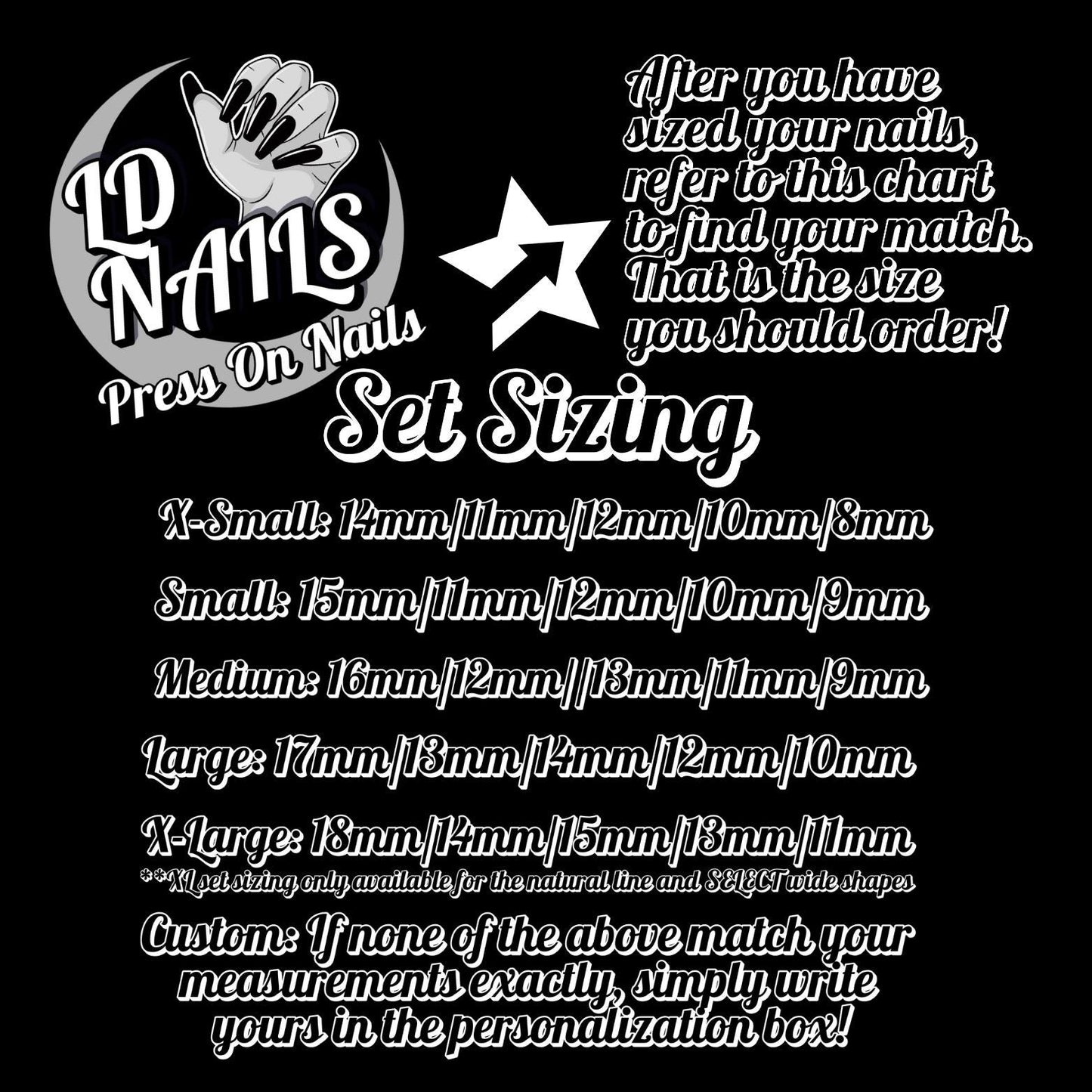 If you choose to measure your own nails, please ensure you are measuring properly. Detailed instructions on how to do so can be found in the “Shapes & Sizing" page.
