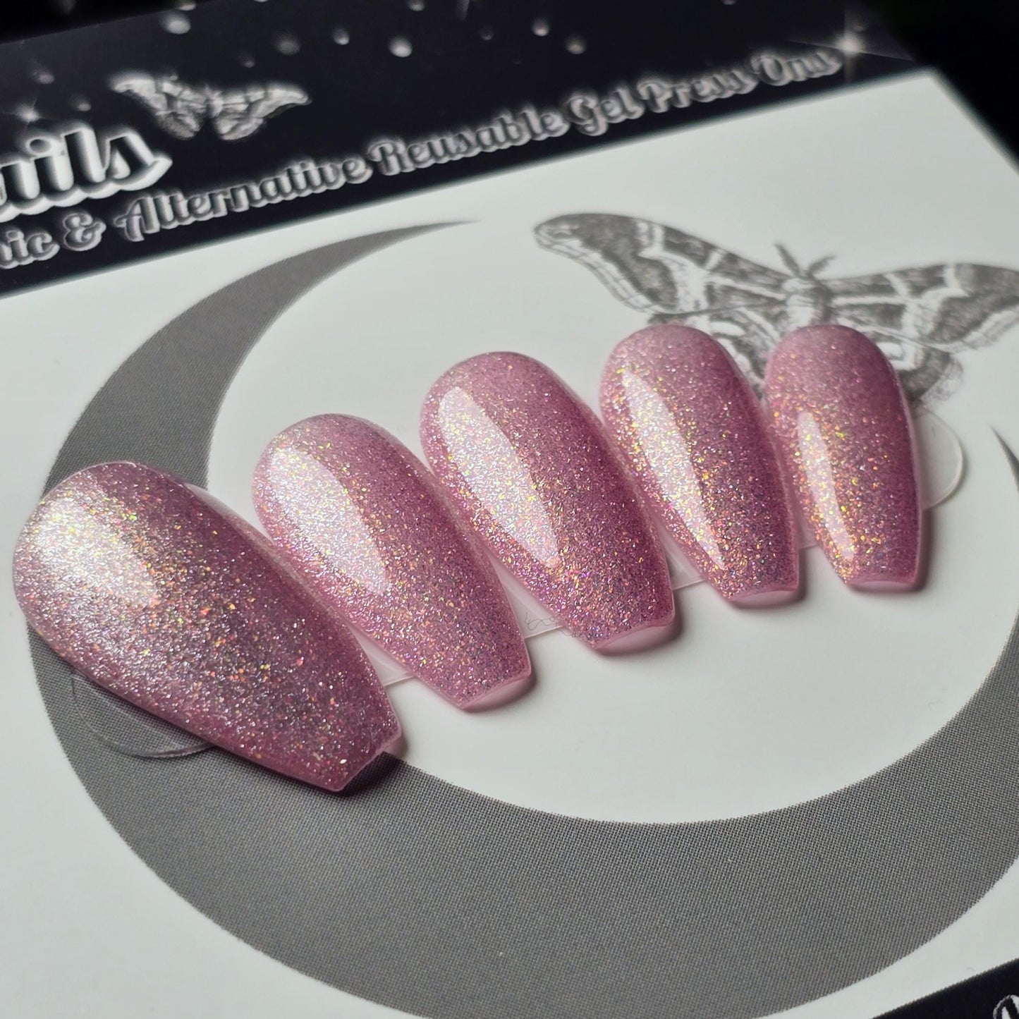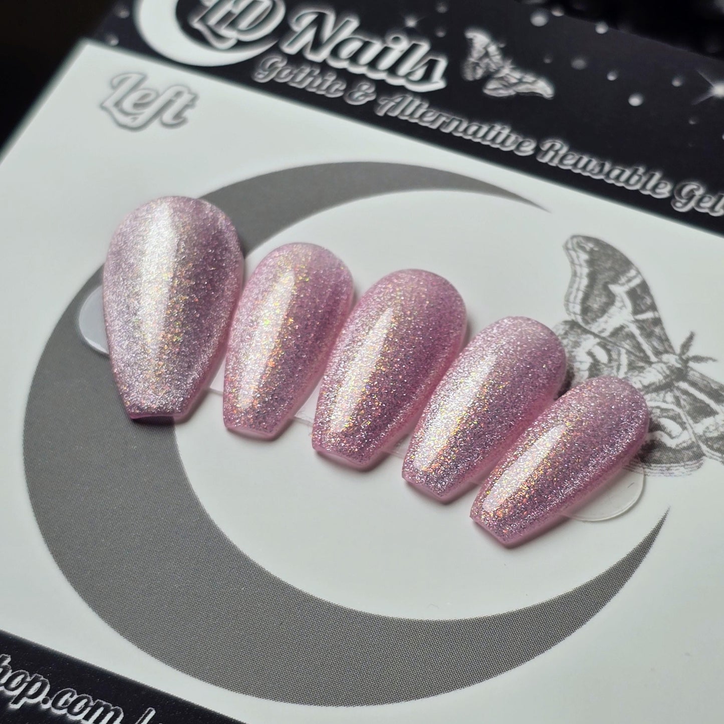 Enchanted Rose press on nails from the Fairytale Cat Eye collection feature a luminous pink cat eye shimmer layered with fine holographic glitter for a romantic fairytale-inspired manicure. These handmade coffin press on nails glow beautifully in the light, creating a magical sparkling effect reminiscent of an enchanted rose. Perfect for lovers of pink glitter nails, fantasy nail designs, and reusable salon-quality press on nails.