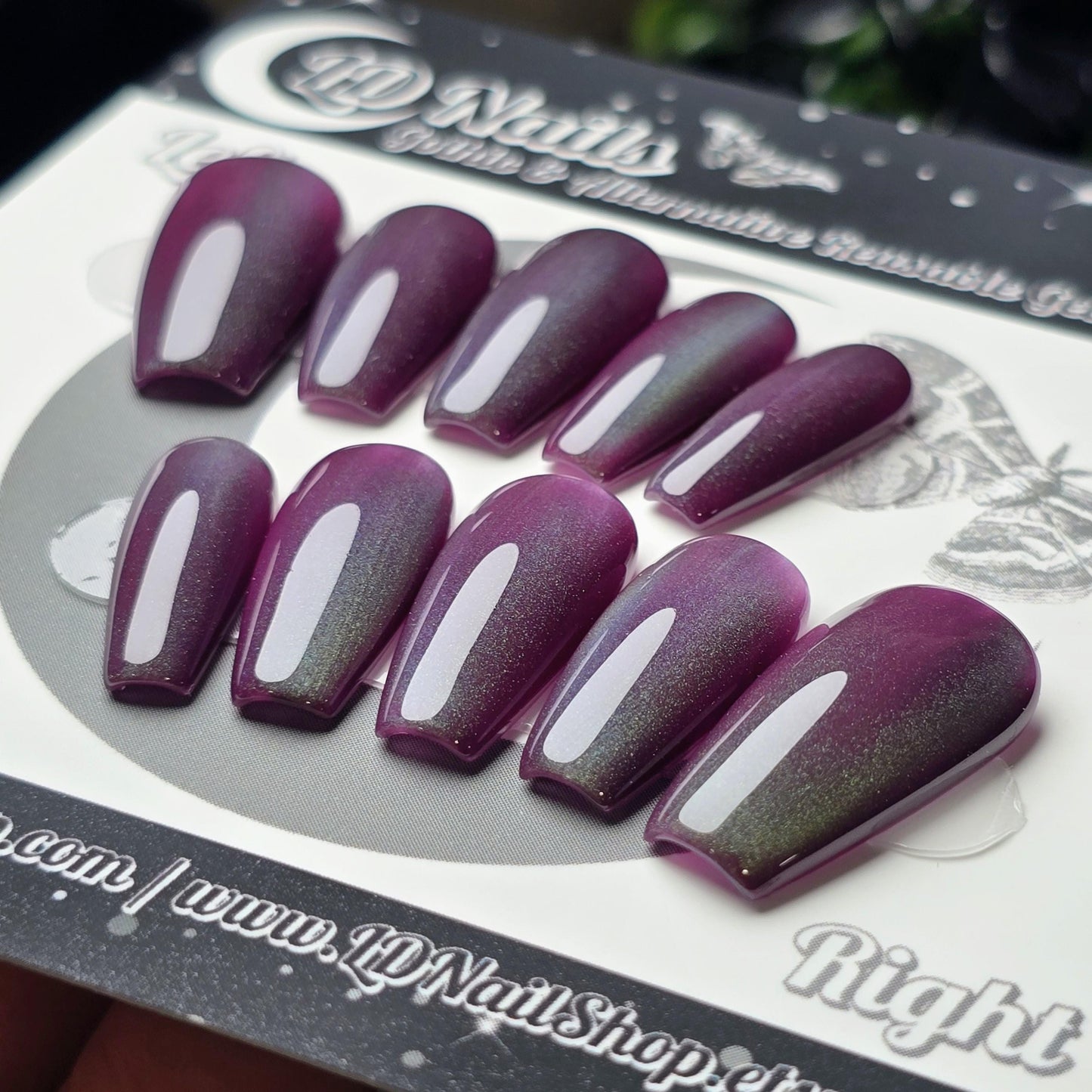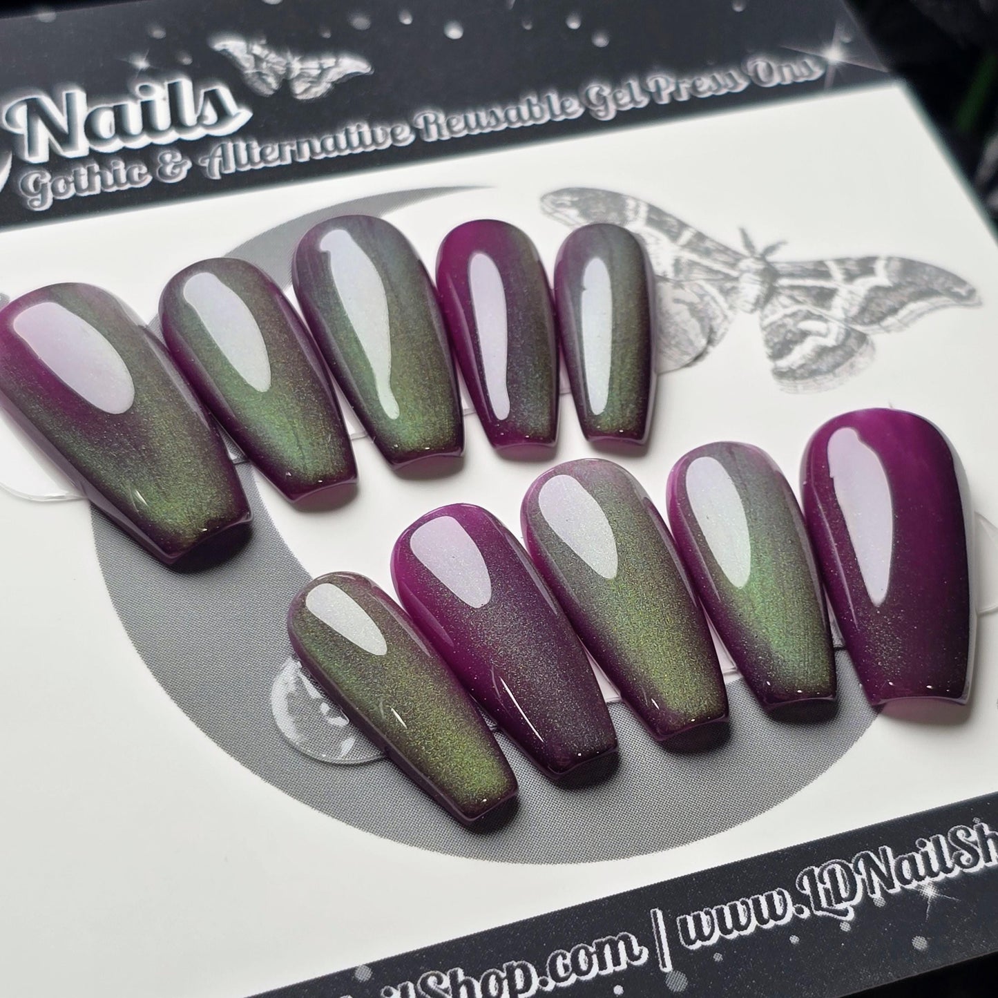 This design blends a deep plum base with an olive-green magnetic shimmer, creating a subtle color shift that glows softly as the light moves. The effect is rich, muted, and organic β perfect for lovers of dark botanicals, witchy aesthetics, and understated gothic glam.