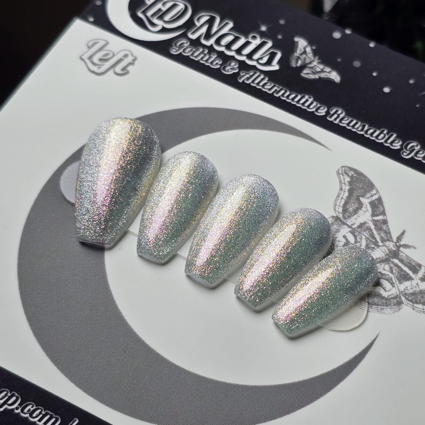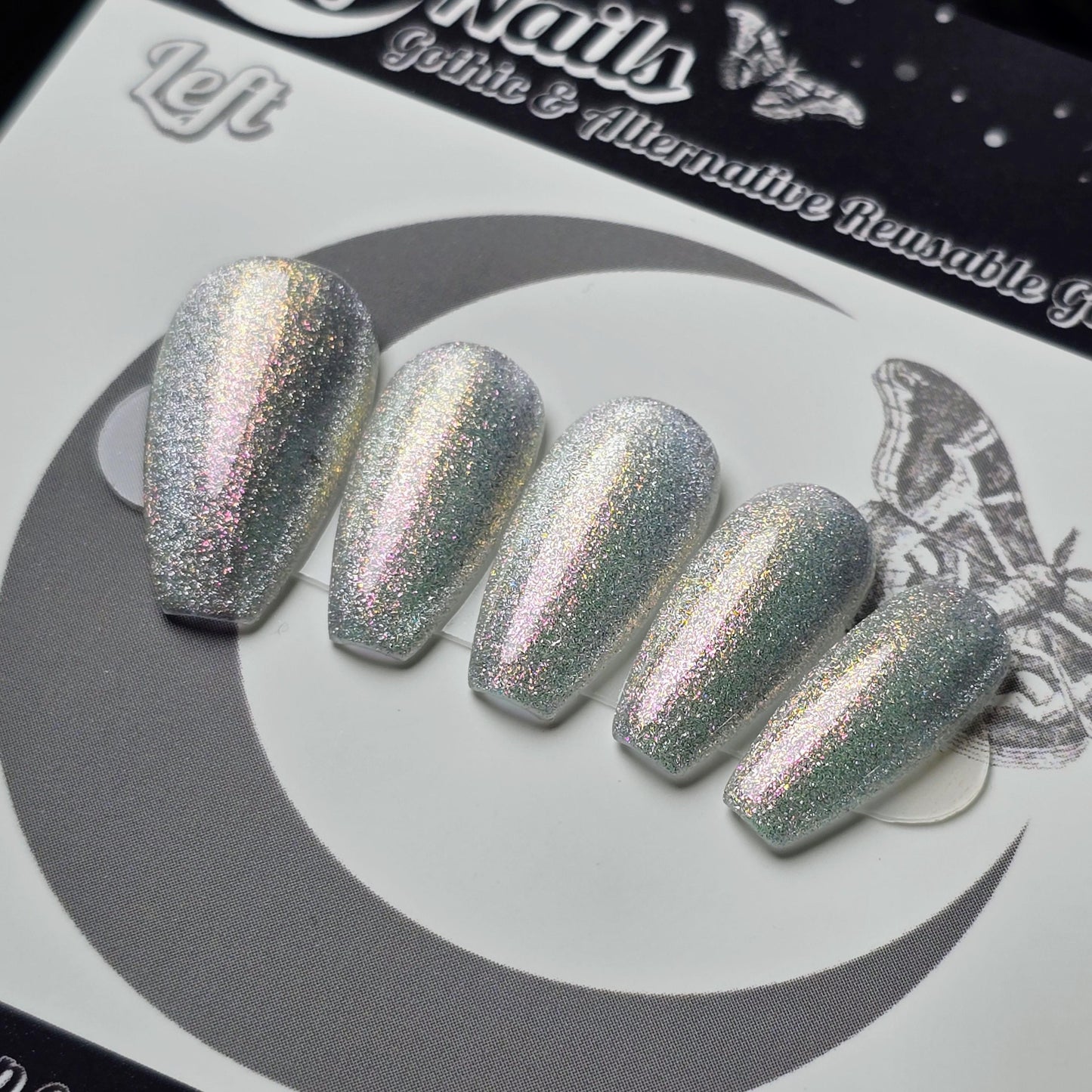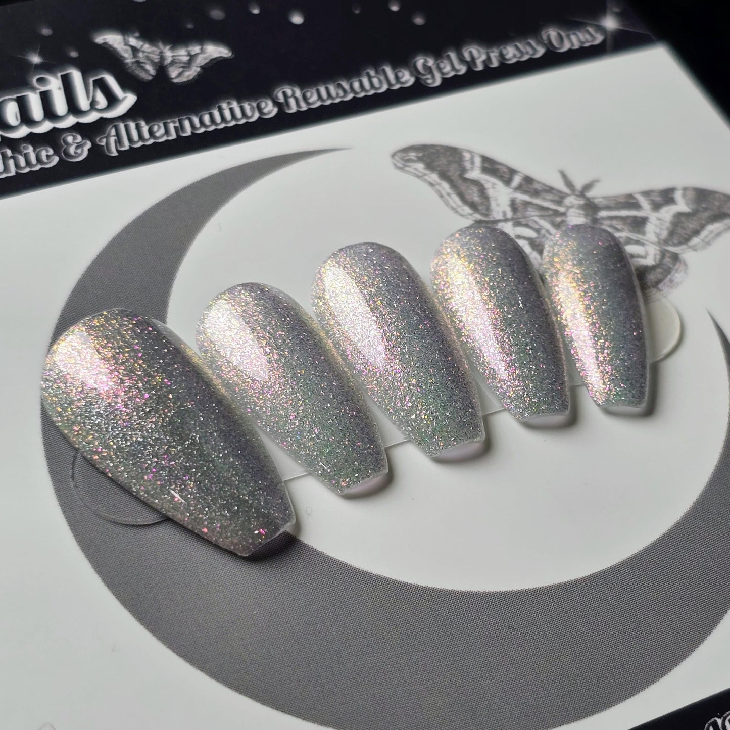 Mirror Mirror press on nails from the Fairytale Cat Eye collection feature a luminous silver white cat eye holographic shimmer layered with sparkling glitter for a reflective mirror-like finish. These handmade coffin press on nails shift and glow beautifully in the light thanks to the magnetic cat eye effect, creating a bold fairytale-inspired manicure. Perfect for lovers of silver glitter nails, sparkling statement manicures, and reusable salon-quality press on nails.