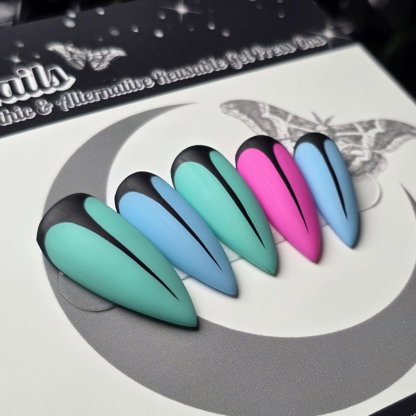 Spring Widow press on nails are a bold neon goth stiletto nail set featuring matte black negative space detailing and striking alternative colors. These handmade stiletto press on nails blend vibrant teal, icy blue, and electric pink with sharp black accents for an edgy cyberpunk and gothic aesthetic. Perfect for anyone who loves alternative fashion, punk style, and statement nails, this reusable press on nail set delivers salon-quality matte stiletto nails without the salon appointment!