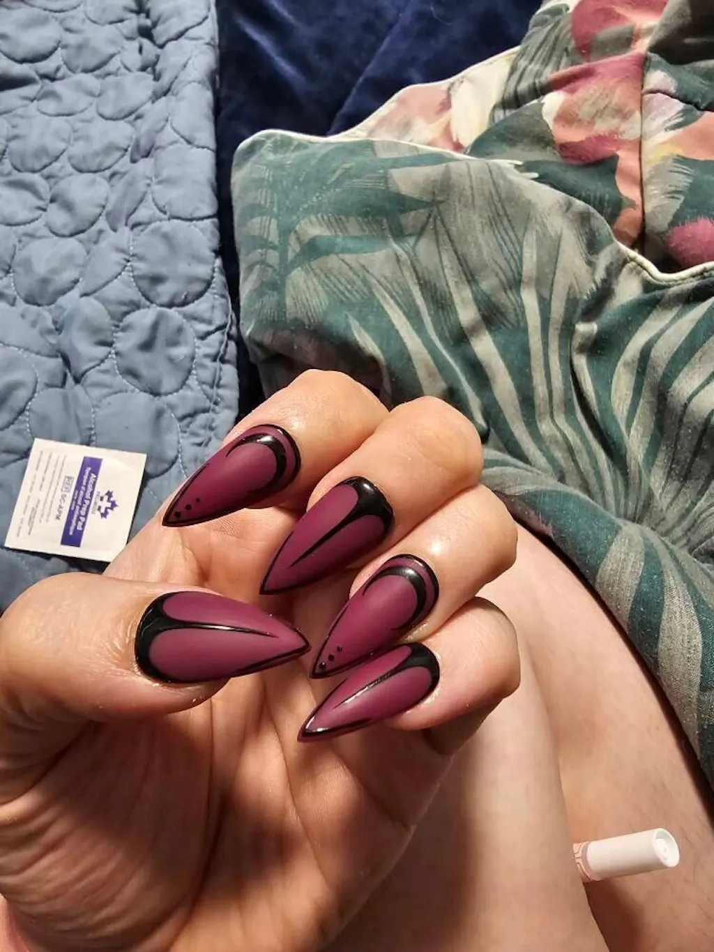 Wicked 2.0: velvet matte maroon witchy moon press on nails with glossy black moons and detailing.